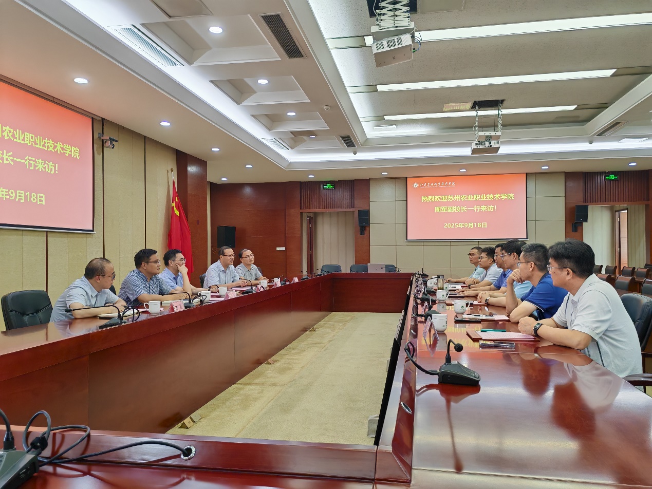 2025年9月18日下午,苏州农业职业技术学院党委委员、副校长周军一行来我院考察交流。我院党委副书记曹仁勇及科技开发处、乡村振兴学院(继续教育学院)等相关部门负责人陪同接待并参加座谈。